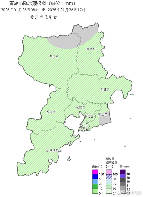 预计26日白天到夜间,全市阴有雨夹雪傍晚前后转小雪,崂山等山区有中雪 ,全市过程累计降水量1~3毫米(图1和图2)。