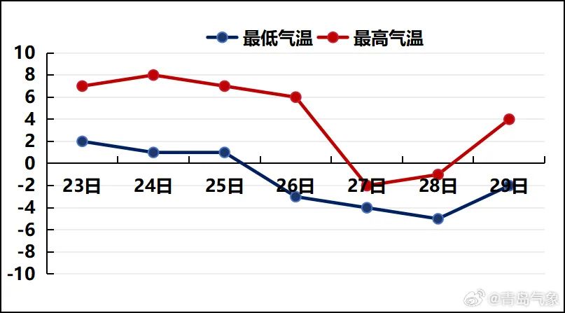 图3 1月23日~29日青岛市区气温预报(单位:℃)