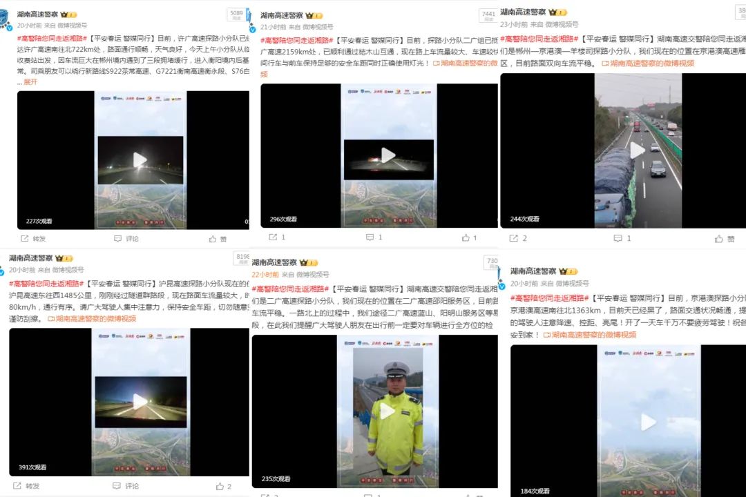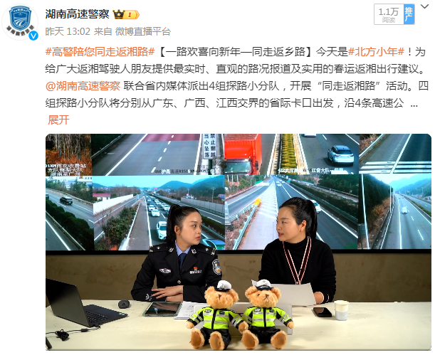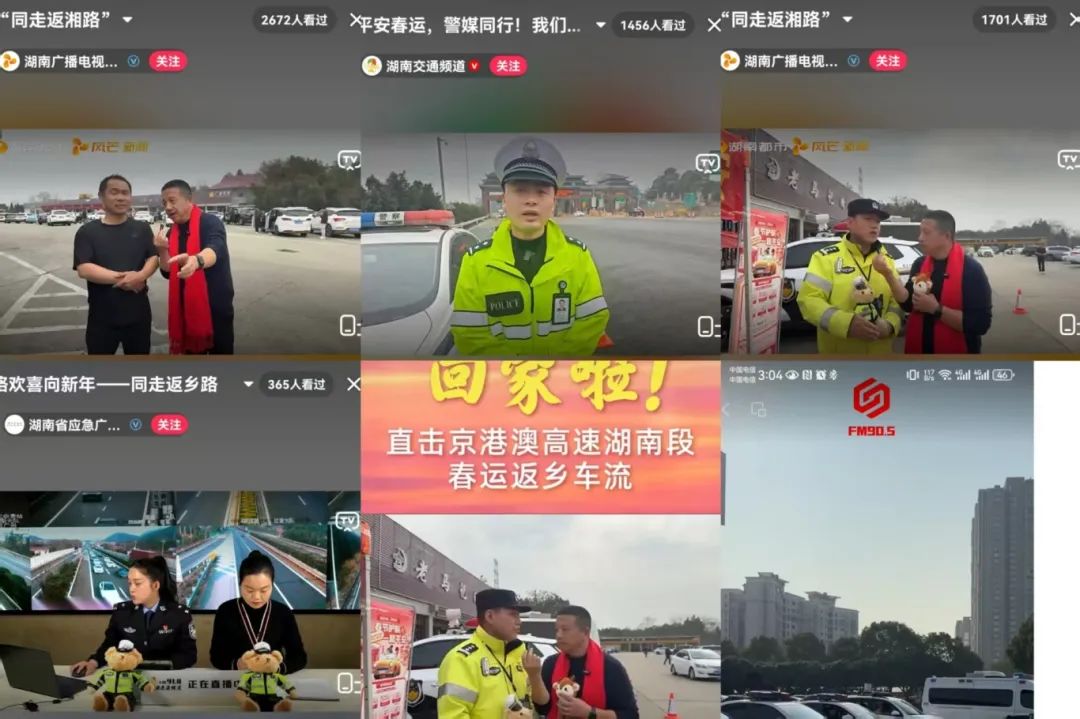 1月21日14时30分,湖南高速警察联合湖南日报新湖南、湖南都市频道、FM90.5中国交通广播(湖南)、FM91.8湖南交通频道、搜狐、潇湘晨报晨视频派出四组探路小分队,分别从广东、广西、江西交界的省际卡口出发,沿京港澳、许广、二广、沪昆4条高速公路行驶至道仁、新晃、城头山、羊楼司。并沿途利用文字、视频、直播等形式介绍路况。