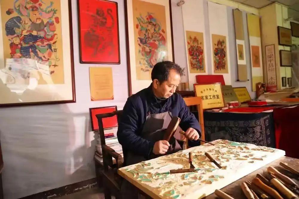 △梁平木版年画国家级传承人徐家辉在雕刻印制年画的印版