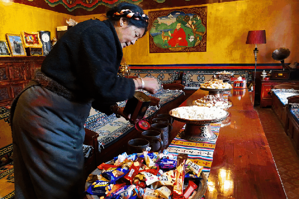 节日期间,藏式糕点也纷纷登场。“推”是其中的代表,这是一种用酥油、红糖、奶渣和面粉制成的糕点。酥油的醇厚、红糖的香甜和奶渣的独特口感完美融合在一起。制作“推”时,主妇们手法娴熟,精心塑形,将对新年的祝福都揉进这小小的糕点里。走亲访友时,一盘盘“推”被端上桌面,传递着浓浓的情谊。还有藏式血肠,堪称新年餐桌上的硬菜。新鲜的羊血混合着剁碎的羊肉和香料,灌入洗净的羊肠,煮熟后,色泽诱人。吃的时候,搭配上青稞酒,咬上一口,鲜香在舌尖散开,尽显高原美食的豪迈。