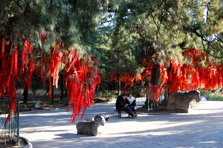 甬道两侧,4棵粗壮的宋柏郁郁葱葱,一簇簇写着“感恩守护”的红绸带缀满枝头。