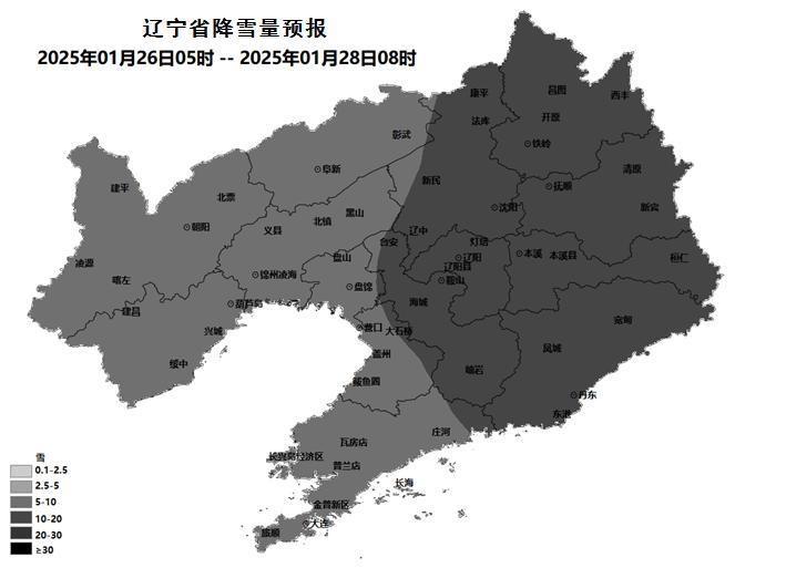 降雪方面,26日早晨至白天,大连东北部、鞍山东部、丹东西部、朝阳、葫芦岛地区有中雪到大雪(4~10毫米),局部有暴雪(10~18毫米),新增积雪深度3~8厘米;其他地区有小雪到中雪(1~3毫米),新增积雪深度1~3厘米。26日夜间至27日夜间,沈阳中东部、大连东北部、鞍山、抚顺、本溪、丹东、营口、辽阳、铁岭中南部地区和沈抚示范区有暴雪(10~20毫米),其中,鞍山中东部、本溪西南部、丹东西部、辽阳南部地区局部有大暴雪(20~30毫米),新增积雪深度8~20厘米;其他地区有中雪到大雪(3~10毫米),新增积雪深度3~7厘米。