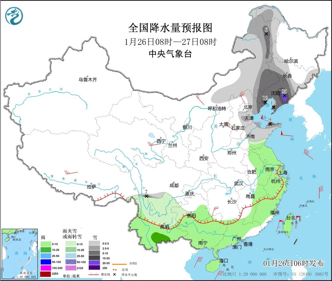 预计,1月26日08时至1月27日08时,内蒙古东部、辽宁、吉林南部、山东半岛北部等地部分地区有大到暴雪,其中,辽宁东部局地有大暴雪(20至25毫米)。上述部分地区新增积雪深度3至8厘米,局地可达10厘米以上。
