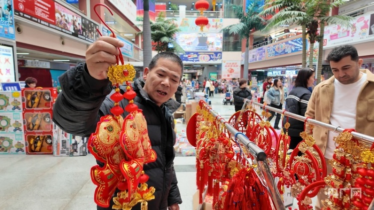 在义乌国际商贸城一区,来自叙利亚的冉德文和他的朋友Himan正在购买年货,各色玩具、新年饰品让他俩眼花缭乱。“我在义乌过了7个年了,已经是半个中国人,今年想给家人准备新年礼物。”冉德文说,他来义乌7年了,开了一家外贸公司,同时在一家中东菜餐厅当餐厅经理,中国过年的喜庆氛围让他觉得很有仪式感。