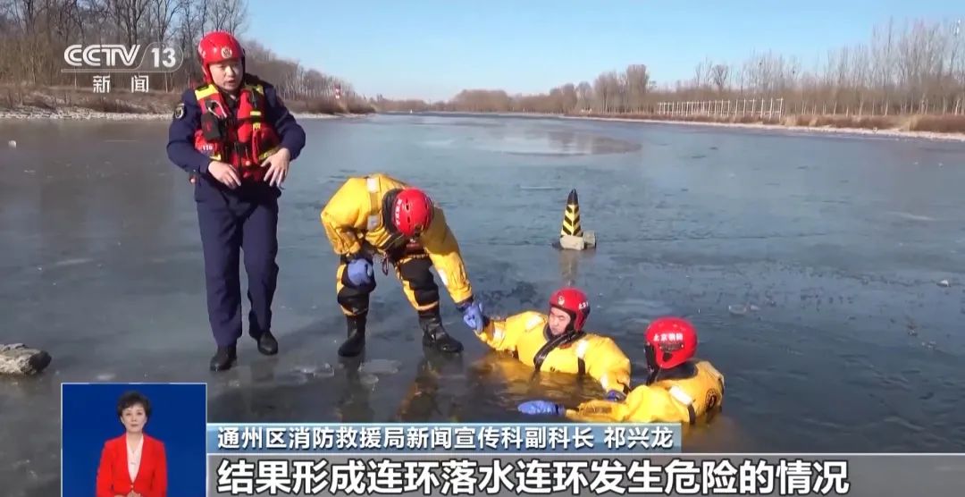 北京市通州区消防救援局新闻宣传科副科长 祁兴龙: 如果说使用手拉手救人的方法,那么在救援的过程中,很容易这名施救的队员也被拉入到水中。而他在落水的一瞬间,由于生理本能的反应,他会将这只手牢牢拽住第二名施救队员的手。由两个人救一个人,瞬间变成一个人救两个人,形成危险的情况。