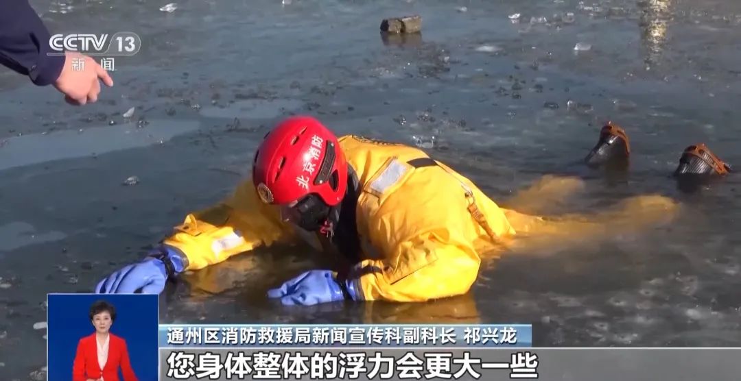 北京市通州区消防救援局新闻宣传科副科长 祁兴龙: 现在我们第一件事是要保证自己不沉下去,并且需要不断地向前爬动。落水时要尽可能保持冷静,放松,肌肉越紧张身体力度越大,就越容易往下沉。而如果肌肉松弛一些,身体整体的浮力会更大一些。