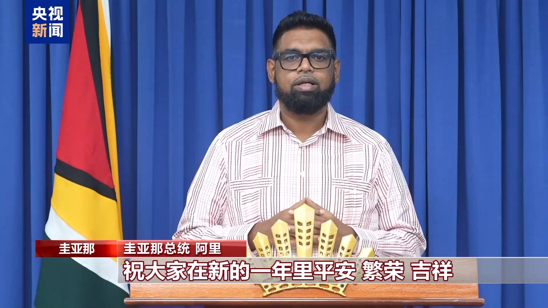 圭亚那总统 阿里:值此中国农历新年和春节来临之际,我代表圭亚那政府和人民,向大家致以最诚挚的祝福。祝大家在新的一年里平安、繁荣、吉祥,新春快乐!