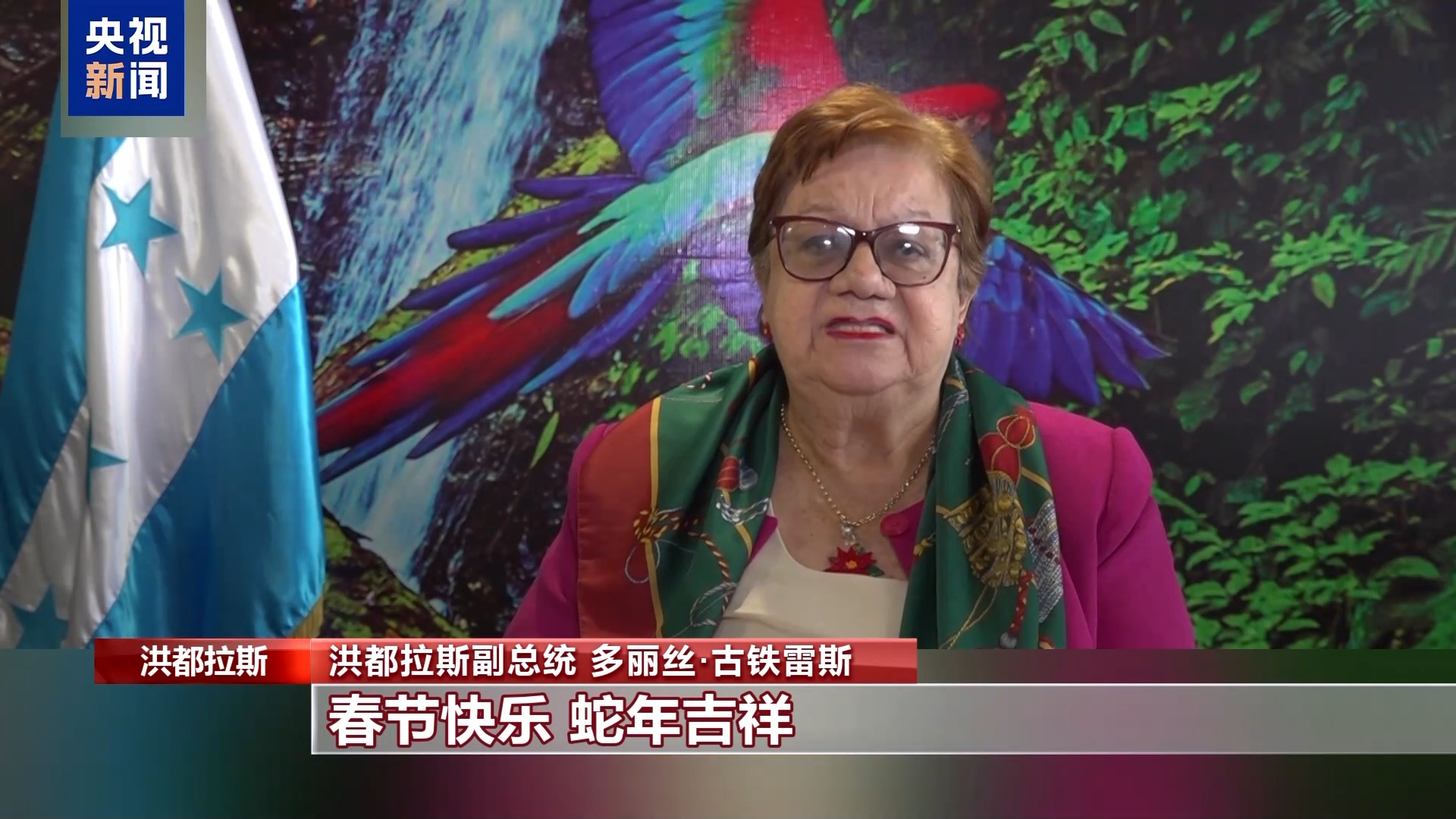 洪都拉斯副总统 多丽丝·古铁雷斯:值此蛇年春节即将来临之际,我代表洪都拉斯政府和人民向中华人民共和国主席习近平致以兄弟般的问候。我们重申将继续致力于加强我国与中国间的合作与双边关系,实现惠及两国民众的共同目标。春节快乐,蛇年吉祥!