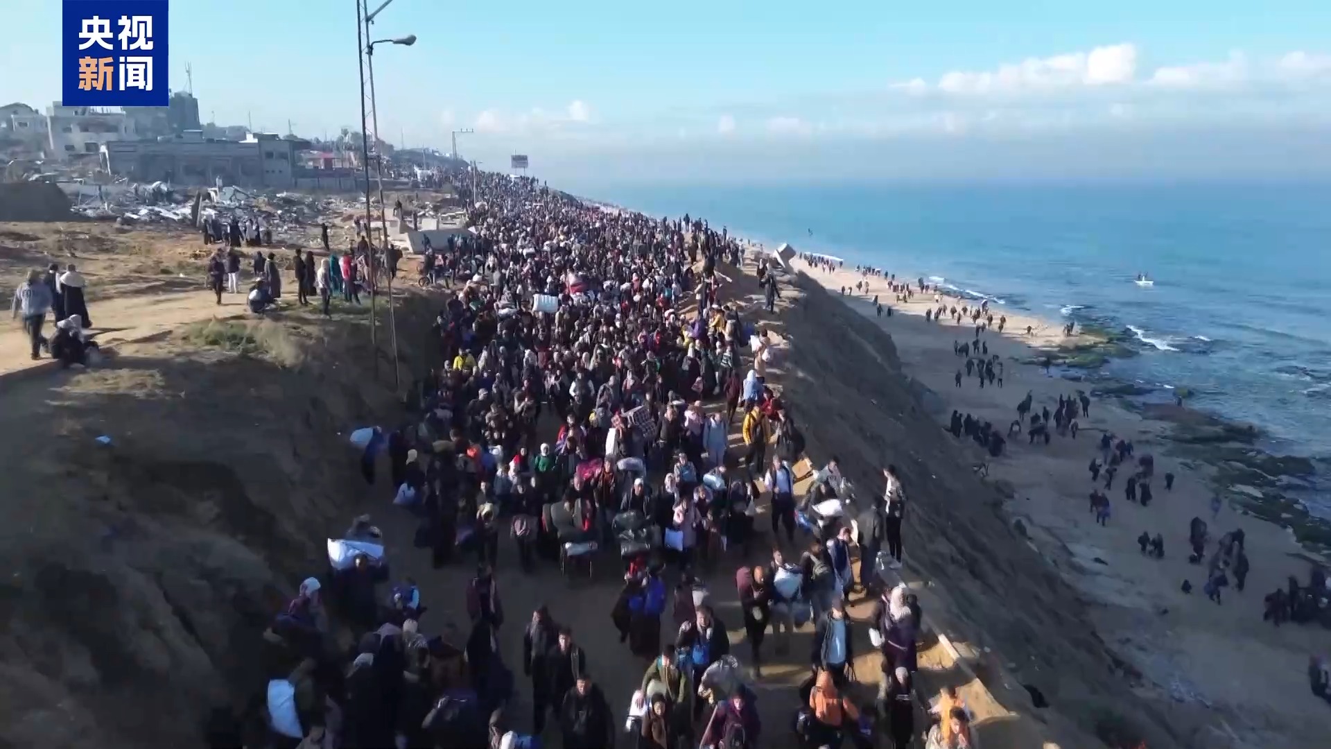以色列国防军当地时间27日上午开始允许巴勒斯坦民众返回加沙北部地区,成千上万巴勒斯坦人在天亮前就已经准备好出发。在总台报道员的航拍镜头下,民众沿着纵贯加沙地带的沿海公路向北行进,人流和车辆绵延数公里长。在回家的路上,很多加沙民众还能想起离开时的情形。