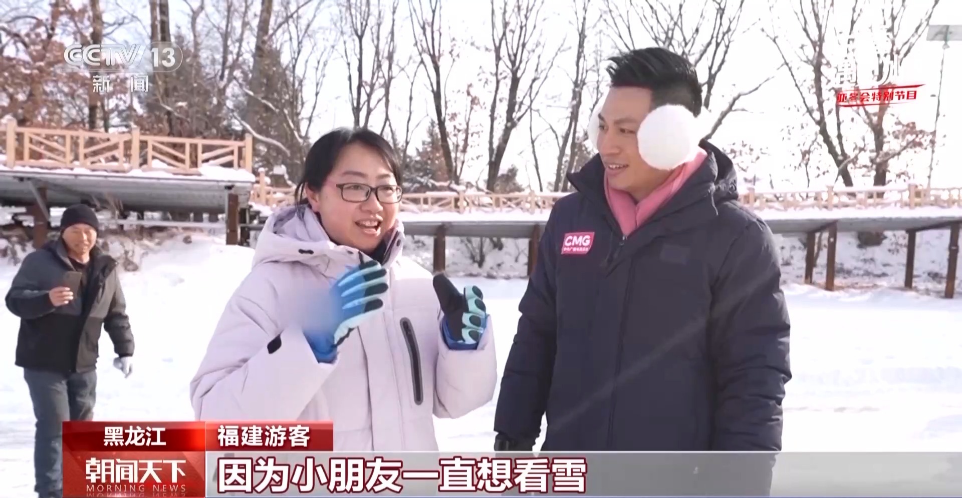 福建游客:因为小朋友一直想看雪,想看真正的雪,他去年就想来结果没成行,今年就一定要来了,真的很好玩。