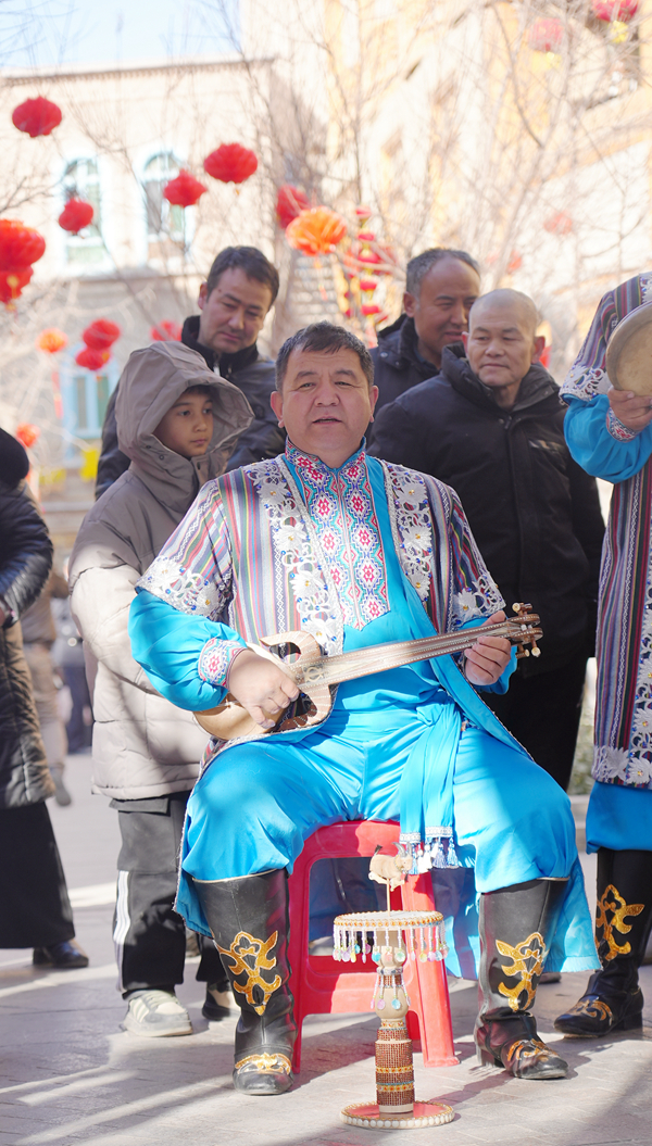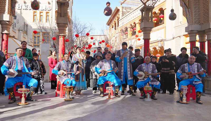 身穿靓丽演出服的民间艺人弹着热瓦普唱着歌