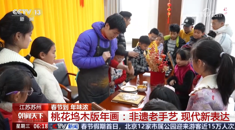 这两天,在苏州甪直古镇鸿运社区活动中心,孩子们围在年画艺人旁,学习如何制作年画。首先,在已经雕刻好的木板上着色,然后再将纸张覆盖上去,轻轻按压,缓缓揭开,一幅喜庆的年画便跃然纸上。