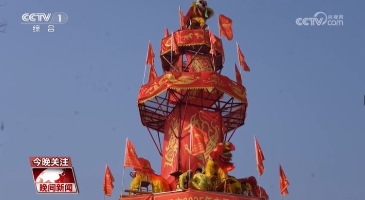 百狮齐舞迎新春,在河南漯河,一场非遗表演“九狮飞天”热闹上演。只见舞狮者脚踩空中绳索,跳跃、腾空,在17米高的“通天塔”上展开了一场狮王争霸赛。精彩的表演引得观众连声叫好。