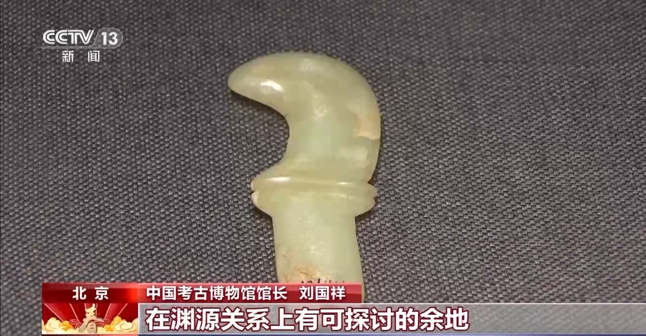 中国考古博物馆馆长 刘国祥:有一件是红山文化晚期的,距今五千多年;还有一件出自安阳殷墟的妇好墓,商代晚期,距今三千多年,都属于红山时期古人雕琢出来的器类。传下来的,红山文化的器类为什么在殷墟妇好墓里面出土,这说明商文化跟红山文化,在渊源关系上有可探讨的余地,甚至有一种说法认为红山先民可能是商王朝的重要来源之一,可以看出文化之间的传承和交流。