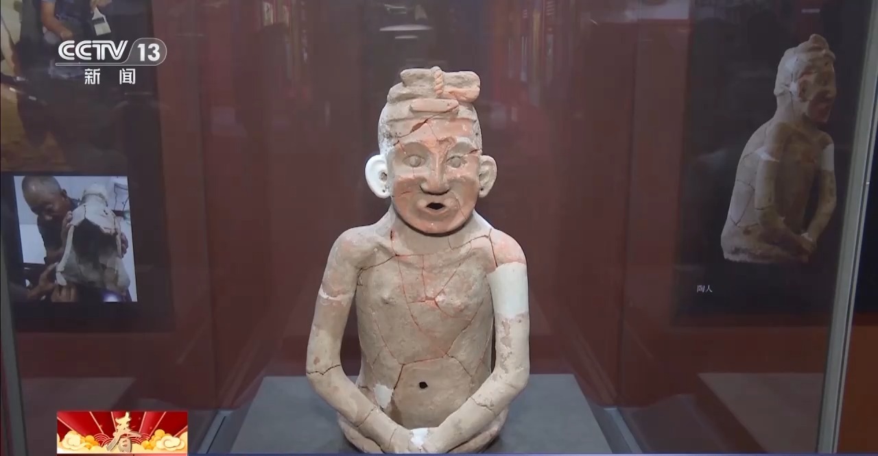 中国考古博物馆馆长 刘国祥:我们借展到一件珍贵的文物,它来自内蒙古敖汉旗博物馆。它是一件红山文化的整身陶塑人像,也是目前能够复原出来的,形体最大的红山文化陶塑人像。