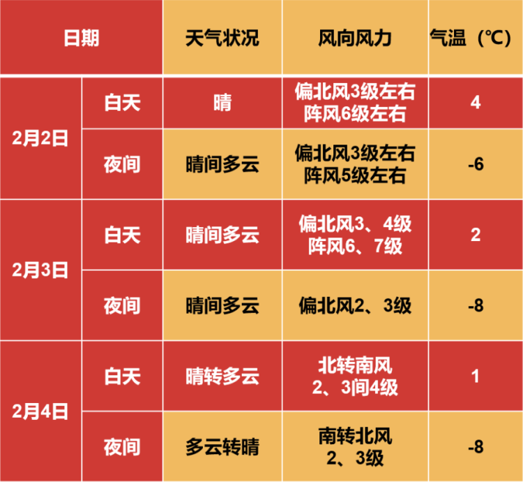根据气象部门预报,2月2日(初五)至4日(初七)天气晴朗,受冷空气影响,2日至3日有明显北风,阵风5、6级。天气情况对返京交通无明显不利影响。
