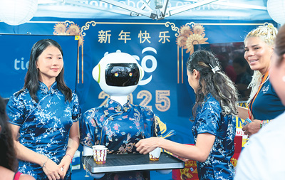 近日,在巴拿马首都巴拿马城的华侨华人欢乐春节庙会上,机器人为游客送上中国茶水。新华社记者 许咏政摄
