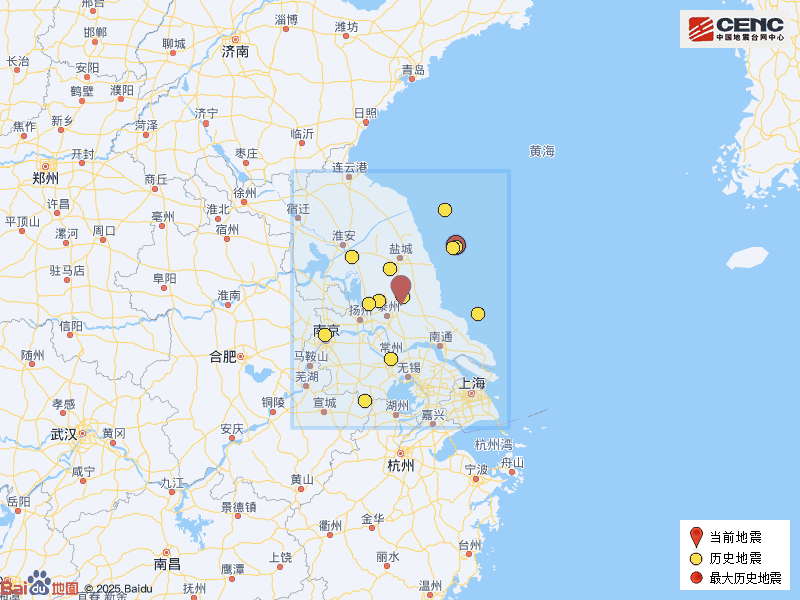 历史地震:根据中国地震台网速报目录,震中周边200公里内近5年来发生3级以上地震共16次,最大地震是2021年11月17日在江苏盐城市大丰区海域发生的5.0级地震(距离本次震中129公里),历史地震分布如图。