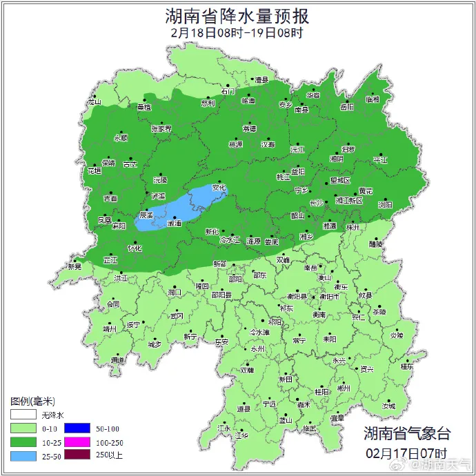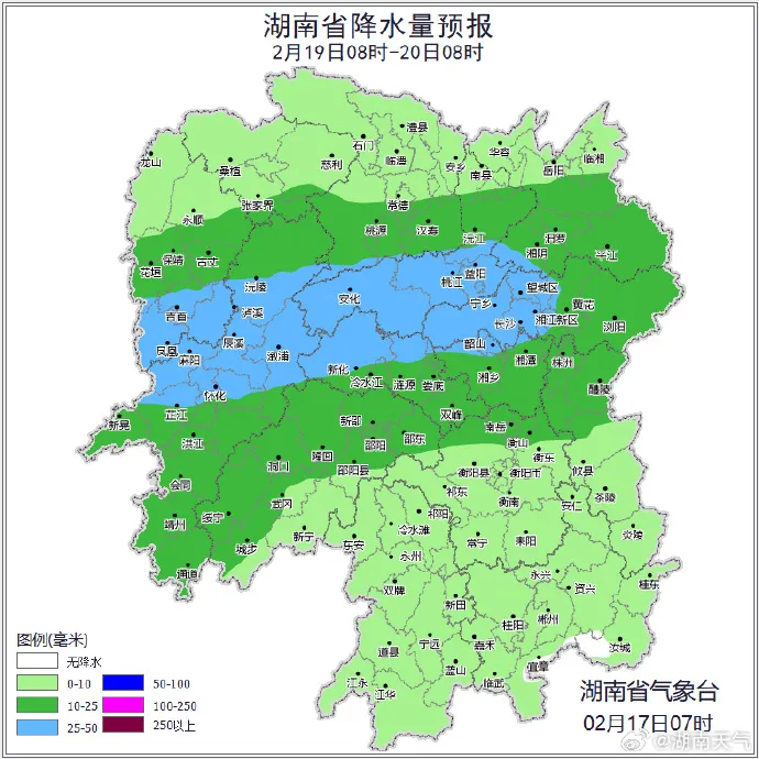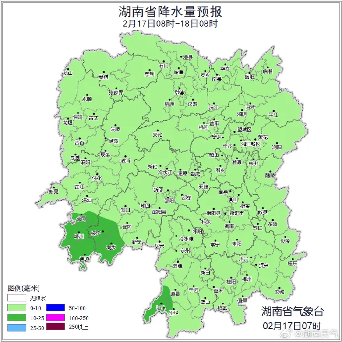 湖南省气象台预计,17日至19日,省内多阴雨天气,湘中以北降水加大,局地大雨;20日至23日,湘中部分地区有中到大雨,其中22日至23日白天,湘西北高海拔地区,有雨夹雪或小雪,局地有冻雨。具体来看: