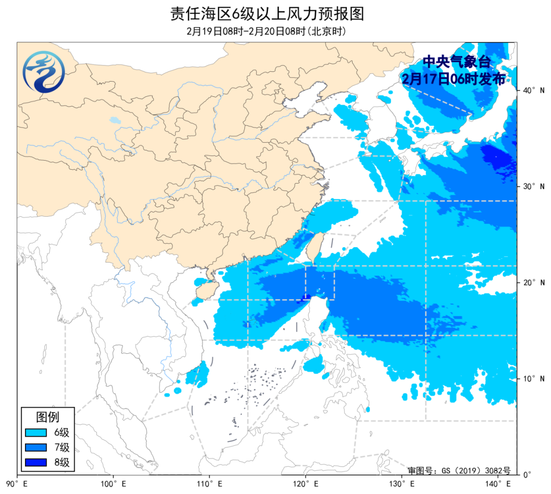 19日08时至20日08时,台湾海峡、南海中东部海域将有5~7级、阵风8级的偏北到东北风,巴士海峡、南海东北部海域将有6~7级、阵风8级的偏东风,黄海北部和中部海域、东海北部海域将有5~6级、阵风7级的偏西到西北风,东海南部海域、台湾以东洋面、琼州海峡、南海西北部和中西部海域将有4~6级、阵风7级的偏东到东北风。