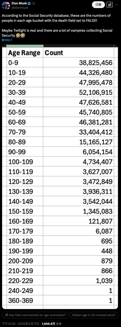 马斯克周一公布了美国社保数据库中,每个年龄段中“是否死亡”字段设置为否的人数。其中存在两个问题:人数对不上和年龄太离谱。