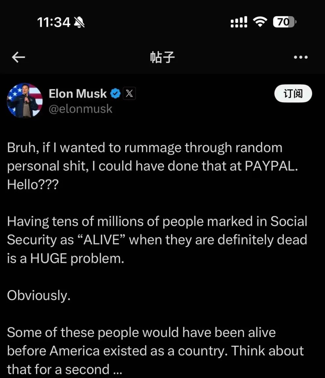 当地时间2月18日,马斯克再次提到此事,称这是一个巨大的问题,“仔细想想,他们中有些人甚至在美国建国之前就已经活着了…… ”