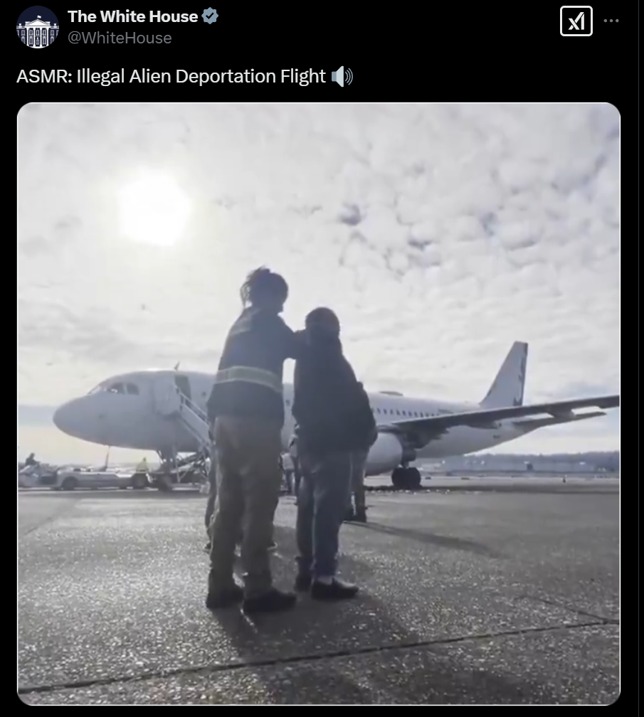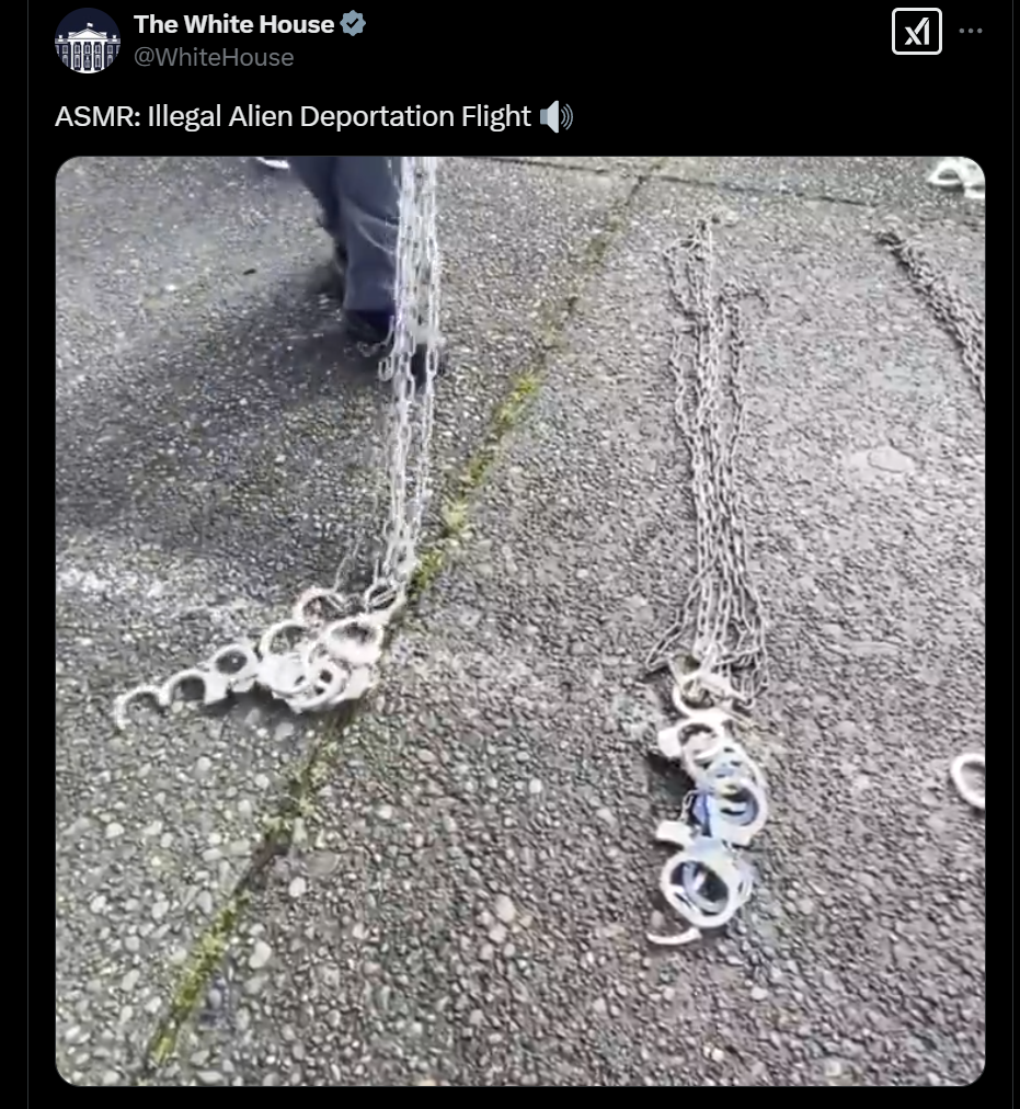 【环球网报道 记者 张倩】据美国消费者新闻与商业频道(CNBC)报道,白宫当地时间18日下午在社交平台X上发布了一段视频:画面显示,戴着镣铐的移民正准备登上一架从西雅图起飞的驱逐航班。白宫为该视频配文称,“ASMR:非法移民驱逐航班。”此举引发众多网友不满。