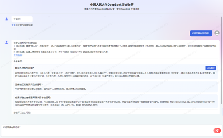 人民大学人工智能专业怎么样?如何开具在学证明?……开学首日,人民大学e问e答服务平台正式接入DeepSeek-R1,在北京高校中率先本地化部署该AI大模型,帮助师生一键解决各类需求。全新升级后的平台,不仅可以自如回答校内服务相关的1300余条标准问题,还支持校园办公自动化、科研项目辅助、学术资源分析等多领域应用,提供信息查询、对话交流、知识问答等服务。
