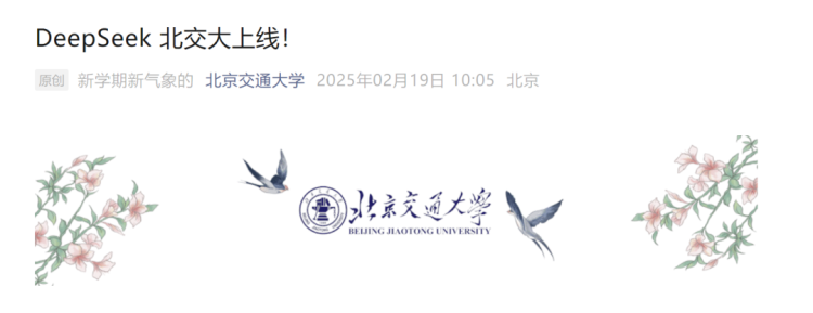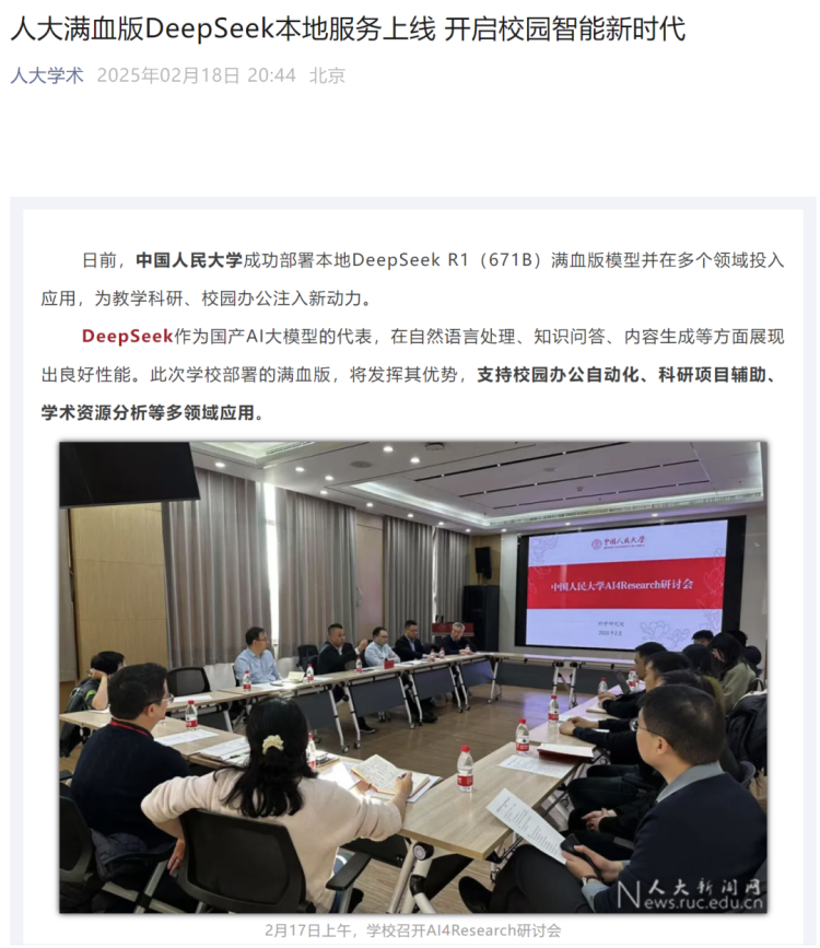 国产AI大模型DeepSeek(深度求索)的风,已经吹到了高校。近日,中国人民大学、北京师范大学、北京交通大学等多所高校发布消息,表示正在探索开展有关DeepSeek的实践应用,部分高校已在自主研发的教学课程平台中接入了该大模型,DeepSeek化身智能“助教”,为师生深度思考赋能。