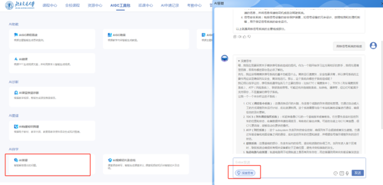 北京交大的教师近日也用上了会深度思考的智能助手。该校教学运行中心在智慧教学课程平台中全面接入DeepSeek-R1大模型,利用其在数学、代码、自然语言处理等方面的强大推理能力,帮助教师高效解决课程教学过程中各类复杂问题。该校表示,目前“深度思考”功能对全校教师开放,后续将逐步对学生开放,并上线更多AI功能。