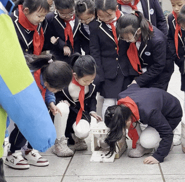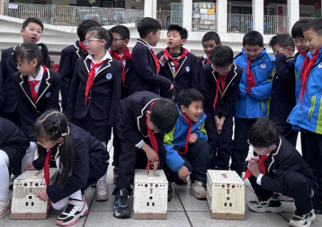 他们排队来到户外,打开6个鸟笼,其中的鸽子振翅飞出,在教学楼上空盘旋。现场“哇”声一片,一双双小眼睛跟随着鸽子,眺向远方。