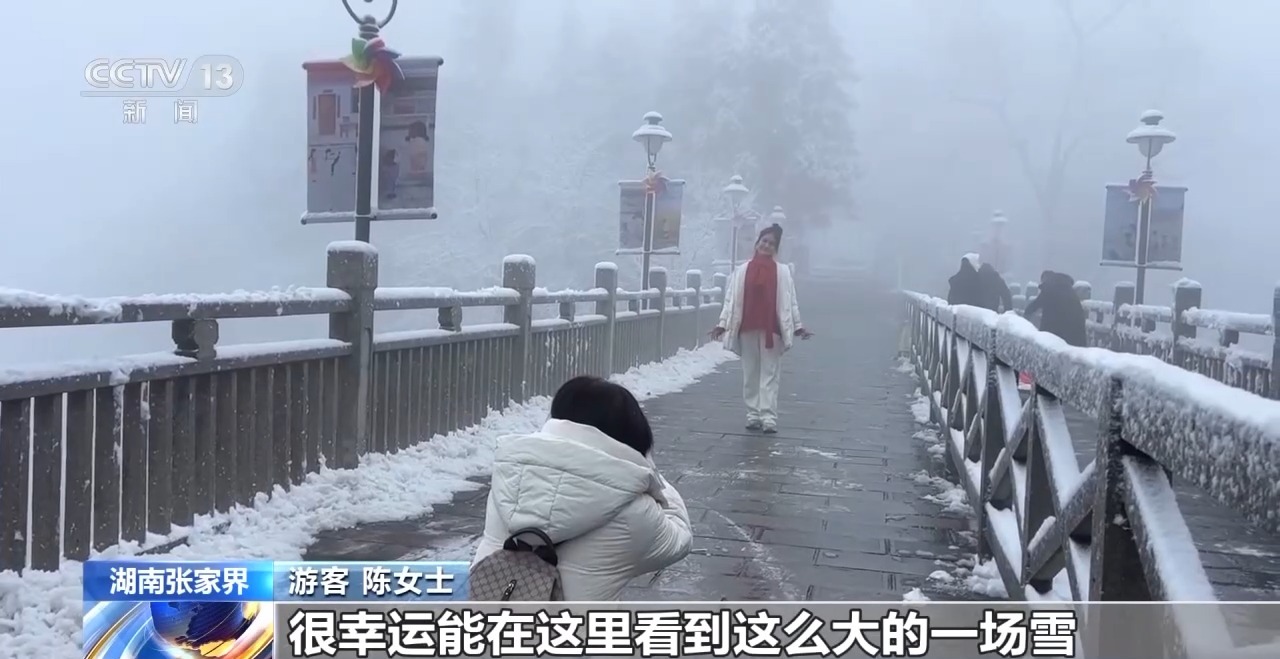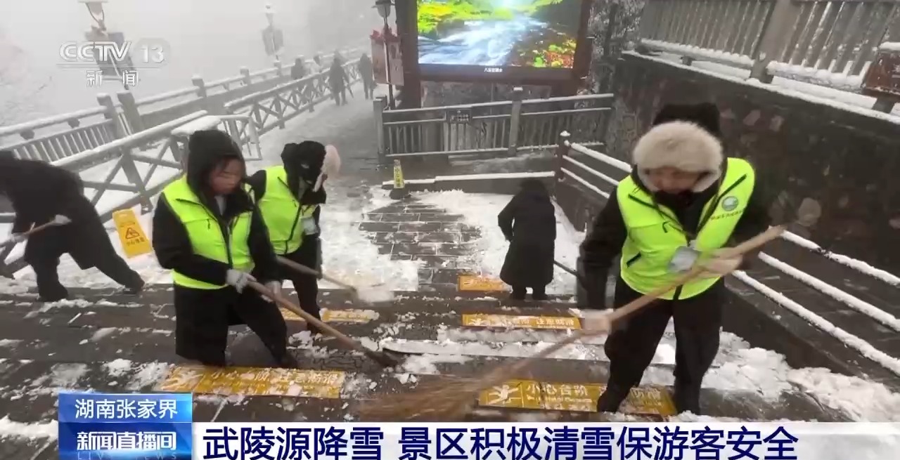 截至20日15点,张家界高海拔景区和山区降雪停止,积雪厚度超过8厘米。工作人员在重点路段撒布融雪剂,对游览步道和观景平台等区域的积雪进行全面清理,在往返景区的客运环保车上加挂了防滑链,保障游客出行安全畅通。气象部门预报,未来两天,张家界武陵源景区仍会有降雪。