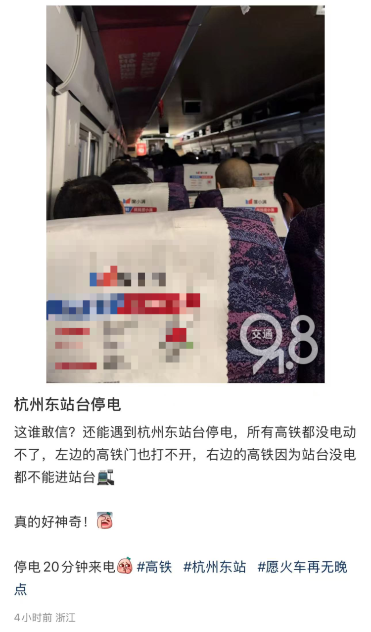 今天(2月21日)下午,不少网友发帖称,杭州东站站台出现停电情况。