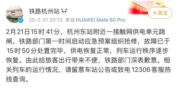 2月21日15时41分,杭州东站附近一接触网供电单元跳闸。铁路部门第一时间启动应急预案组织抢修,故障已于15时50分处置完毕,供电恢复正常,列车运行秩序逐步恢复。由此给旅客出行带来不便,铁路部门深表歉意。相关列车的运行情况,请留意车站公告或致电12306客服热线查询。
