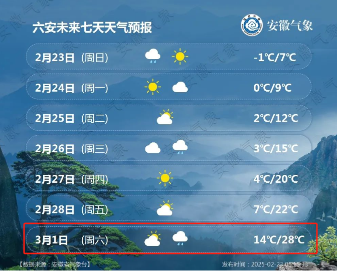 3月1日,六安高温达到28℃,马鞍山、芜湖、宣城、铜陵高温达27℃。