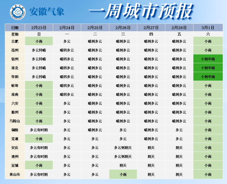 3月1日(周六):全省多云转阴天有小雨,其中江北部分地区中雨。