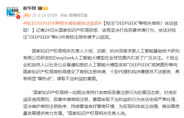 【抢注“DEEPSEEK”等相关商标?依法驳回!】记者24日从国家知识产权局获悉,该局坚决打击恶意申请行为,依法对抢注“DEEPSEEK”等63件商标注册申请予以驳回。