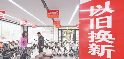 最近,石家庄市和平西路的电动车专卖店生意红火。走进一家雅迪电动自行车门店,以旧换新活动的广告牌格外显眼,前来选购新车的顾客络绎不绝。