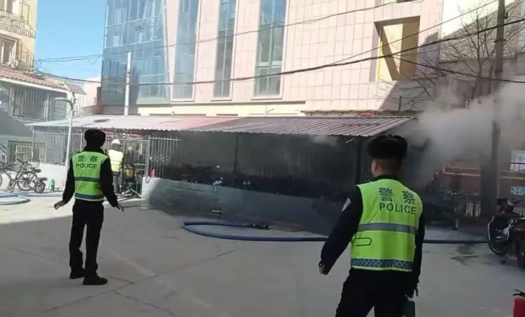 回民区交管八中队的交警副中队长张滨、辅警姚程、董志宏、贾元元正在附近路口执勤。只见不远处小区里冒出滚滚浓烟,交警立即前往查看,原来是小区车棚着火,燃烧较快,火势迅速扩散。