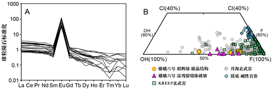 图4 (A) 嫦娥六号斜长石REE配分模式。(B) 磷灰石F-Cl-OH三角图。