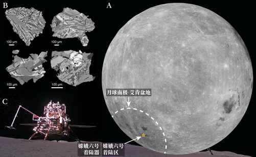 图1 A. 嫦娥六号着陆区,B. 嫦娥六号中的玄武岩岩屑,C. 嫦娥六号着陆器