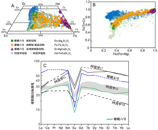 图2 嫦娥六号玄武岩的矿物化学. (A)辉石四边形图。(B) 辉石Fe/(Fe+Mg) VS Ti/(Ti+Cr)图。(C)源区稀土元素丰度配分模式图。