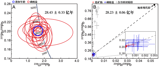图3 嫦娥六号玄武岩的形成年代 (A)磷酸盐U-Pb谐和图。(B) 锆矿物和磷酸盐的Pb-Pb等时线图