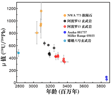 图5 低钛玄武岩的形成年龄与μ值的关系