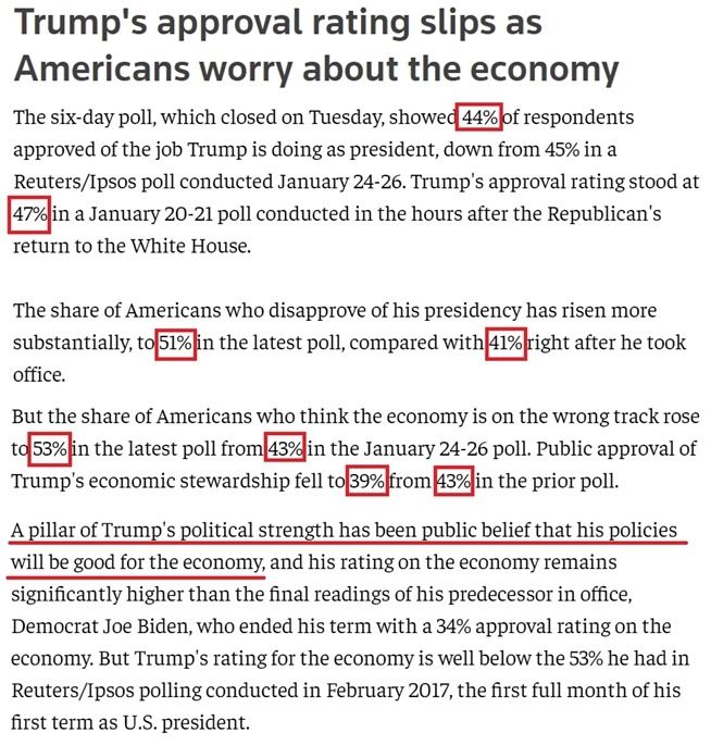 路透社在报道中指出,特朗普政治实力的一个支柱就是不少人相信他的政策对经济有利,而最新民调结果显示,越来越多的美国人因为这位新总统威胁要对外加征关税而对美国的经济发展方向感到担忧。