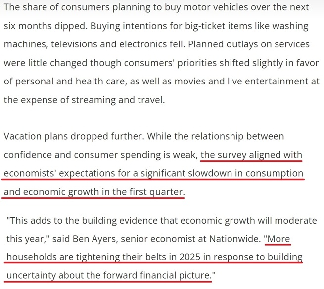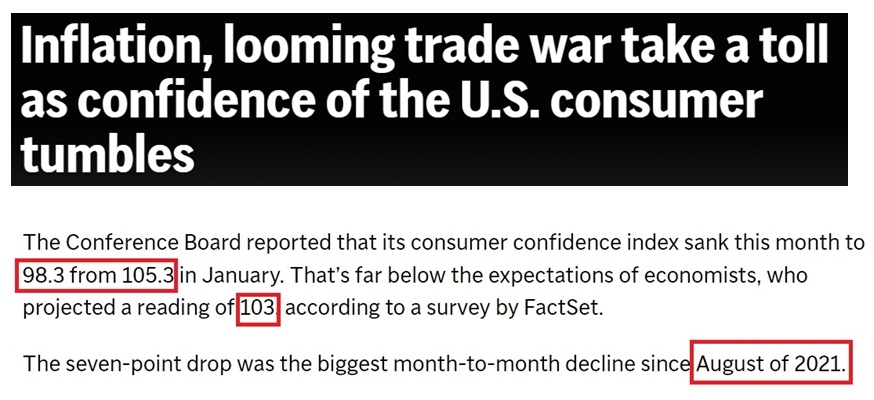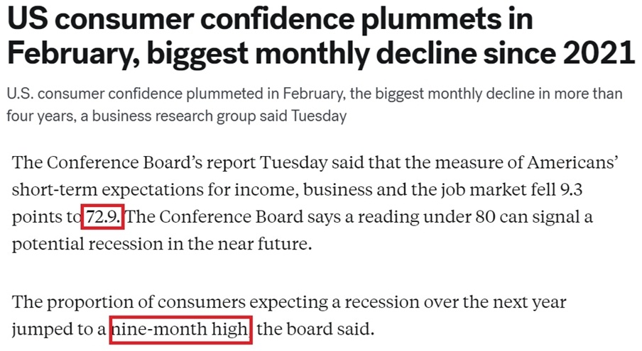 各家媒体纷纷用“暴跌”“直线下降”“急剧恶化”等词汇来形容美国消费者信心的显著下滑。
