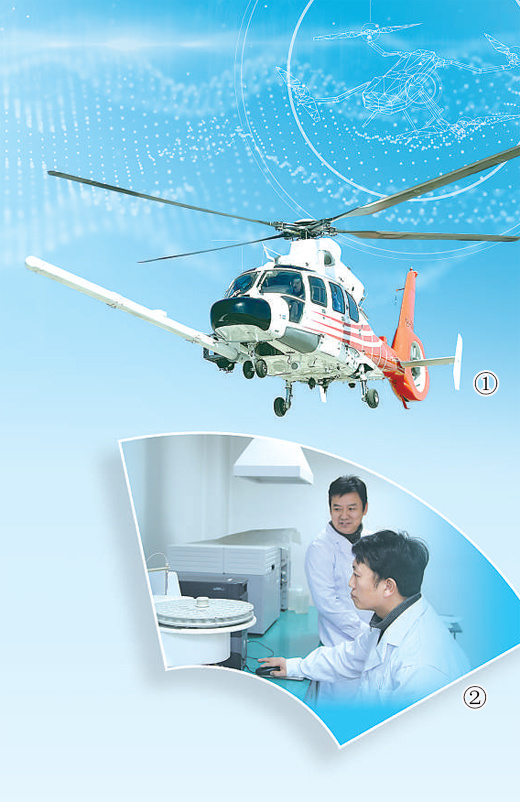 图①:“航空地质二号”直升机。图②:科研人员正在运用地球化学技术开展研究。