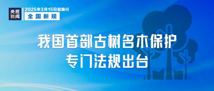 《古树名木保护条例》3月15日起施行。条例规定,禁止采伐古树名木,因重大植物疫情防控、抢险救灾等特殊紧急情形,依法采取应急处置措施采伐古树名木的,县级人民政府有关部门应当及时通知县级人民政府古树名木主管部门。