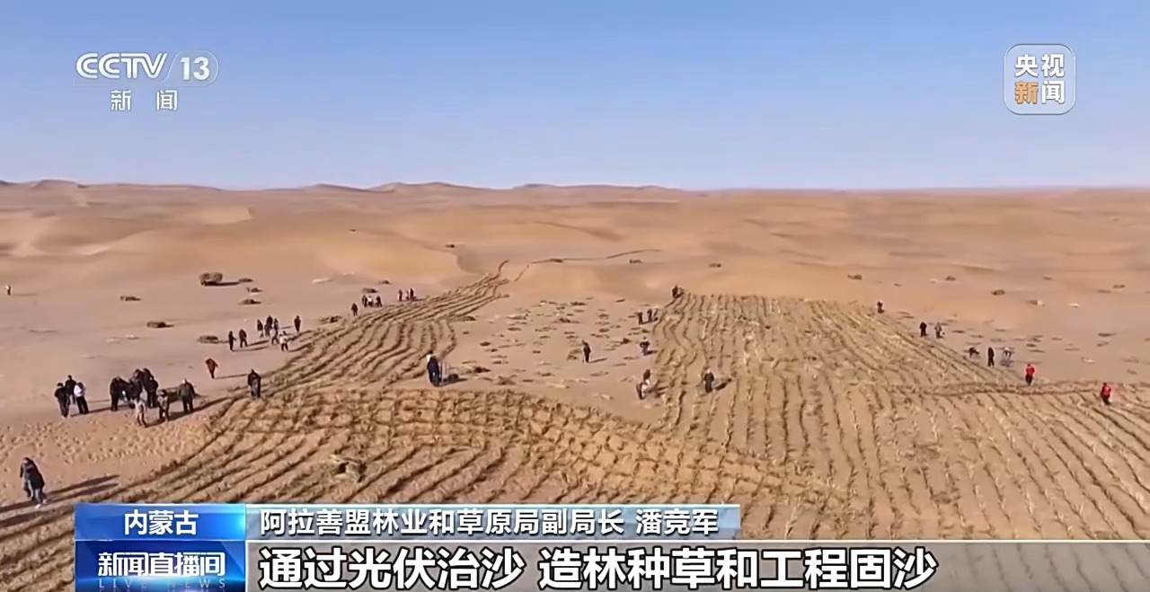 阿拉善盟林业和草原局副局长 潘竞军:目前我们已经治理完1425公里,还有430多公里需要治理。通过光伏治沙、造林种草和工程固沙,我们把这个断带补起来,为河西走廊、宁夏平原、河套平原提供生态安全的保障。